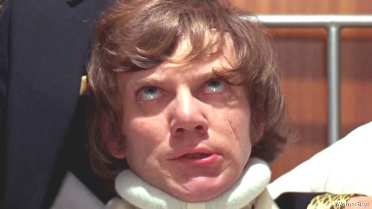 That final scene in A Clockwork Orange is where Kubrick’s cynicism reaches its purest form. Alex, broken and rebuilt by the state, lies in a hospital bed while the Minister of the Interior arrives like a doting parent. The same government that destroyed him now needs him. They feed him, flatter him, hand him a job. When the press pour in, Alex smiles and shakes hands, the model citizen reborn as the Minister beams beside him, a grotesque portrait of power rewarding depravity.
