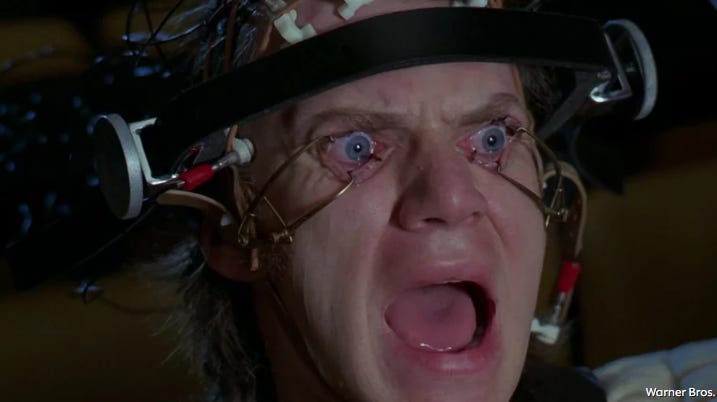 The turning point, for me, is not the early scenes of chaos, but the state’s response. When Alex is captured and subjected to the Ludovico Technique, the audience faces a new kind of horror. He is forced to watch films of violence while his body is conditioned to reject them. His free will is erased. He cannot even defend himself when attacked. What was once choice becomes programming. Kubrick flips the morality on its head, the monster becomes the victim, and the cure becomes the crime.